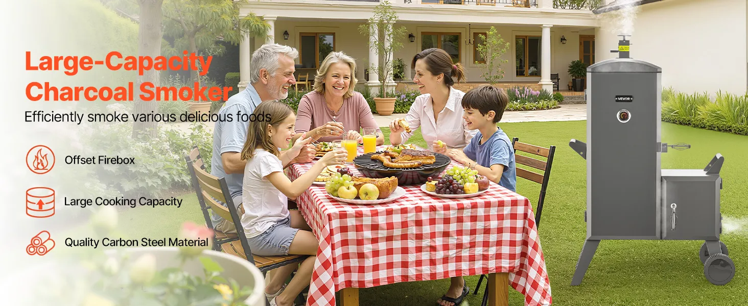 Enjoy rich, smoky, and delicious food with the VEVOR charcoal offset smoker. Its offset firebox design that separates the cooking chamber from the charcoal chamber, allowing you to add charcoal easily without interrupting the smoking process—delivering a more authentic and flavorful BBQ taste.