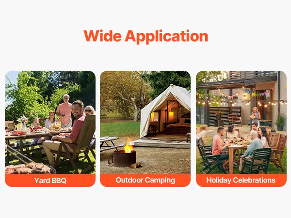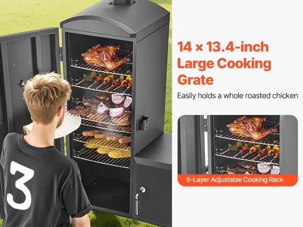 This charcoal BBQ smoker includes 6 adjustable cooking grates (14 x 13.4-inch), providing a large cooking space for large pieces of ingredients, meeting diverse cooking needs.