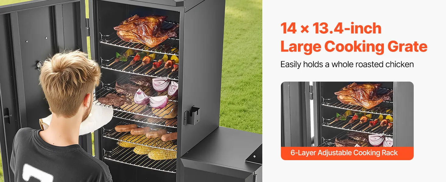 Spacious Cooking Area: Equipped with 6 adjustable cooking grates (14" x 13.4"), our charcoal BBQ smoker lets you cook multiple foods at the same time. Enjoy less waiting, fewer batches, and more authentic smoked dishes for gatherings and parties