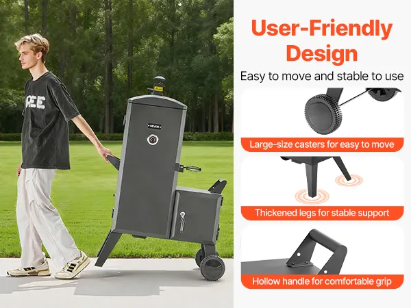 Our charcoal offset smoker features smooth-rolling wheels and hollow side handles for effortless mobility. Reinforced legs provide stable support, combining portability and stability for a more convenient BBQ experience.