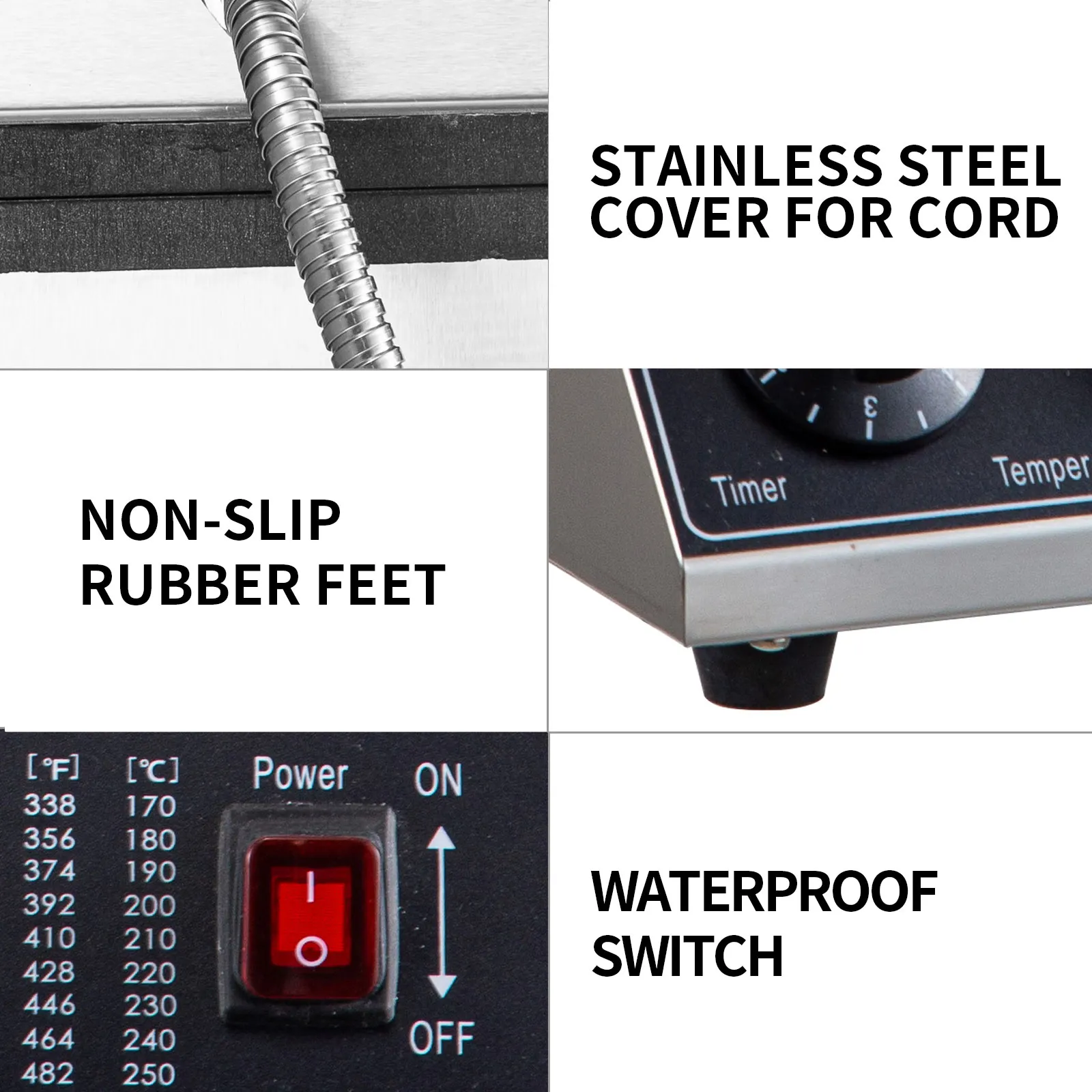 The wire is protected by a stainless steel sheath, featuring a waterproof switch, for improved reliability and security. Furthermore, four nonslip rubber foot pads boost stability during operation.