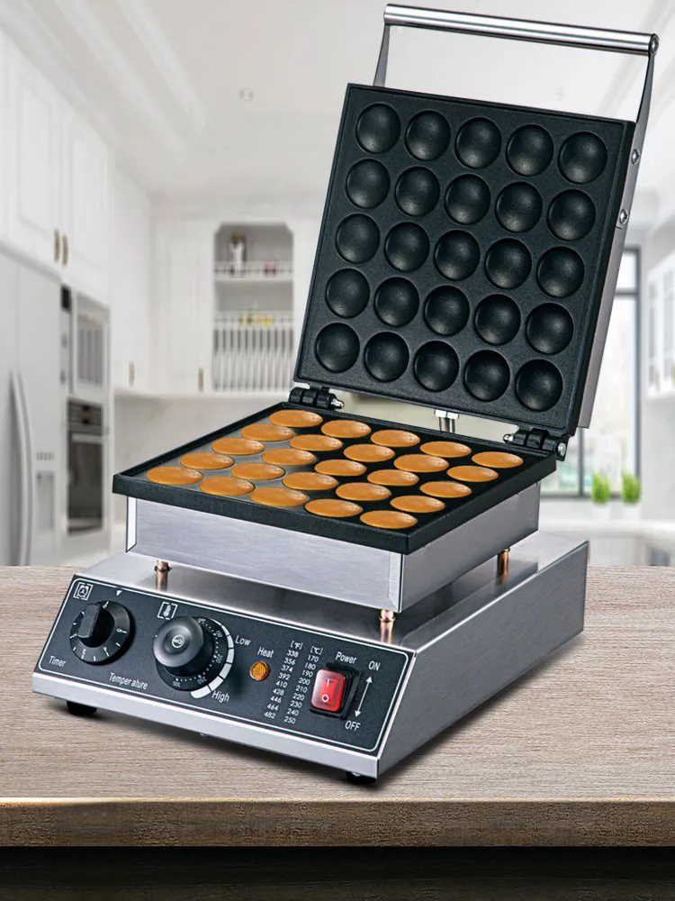 Making up to 25 mini dutch pancakes, also known as poffertjes, with this professional baker is as easy as ever. The parallel Teflon coating heating plates ensure the perfect golden-brown color of each mini pancake. This VEVOR's mini waffle maker is suitable for home use as well as for any catering business. With a compact body, it takes little space and can be used even in small kitchens.