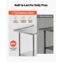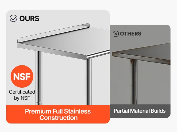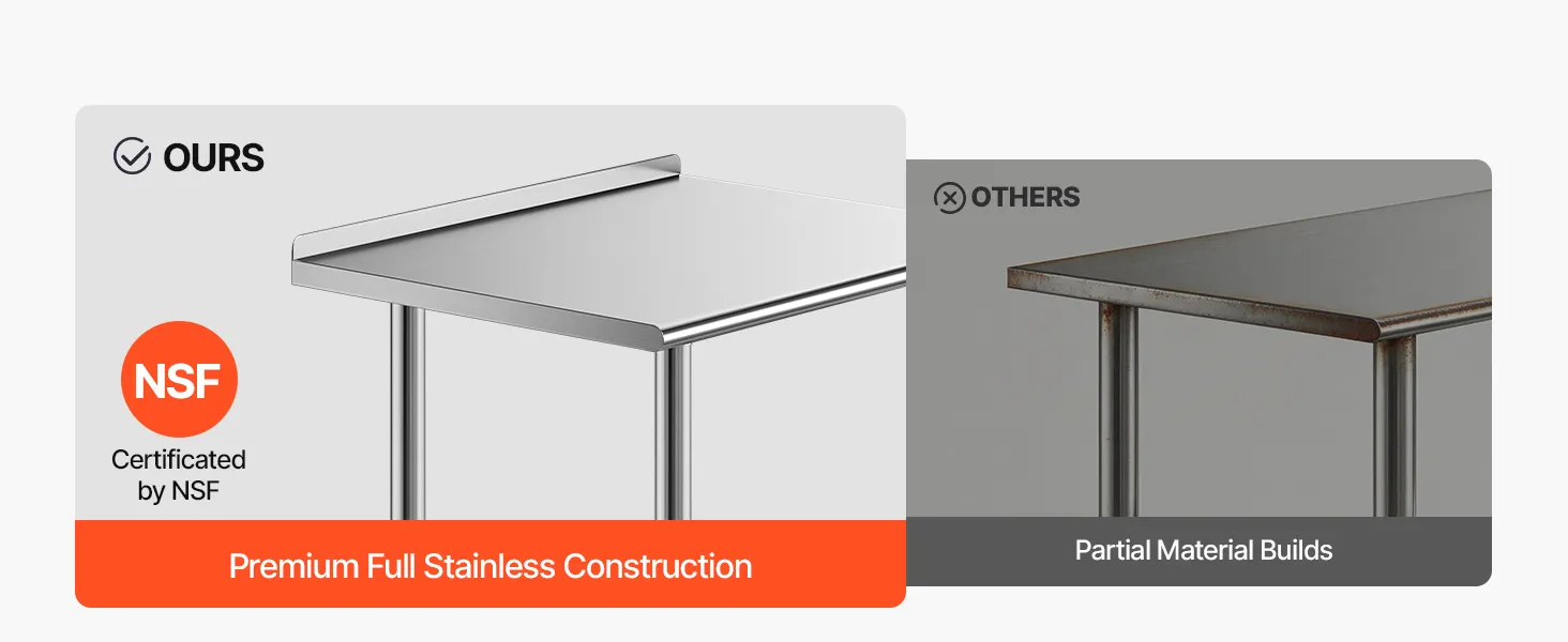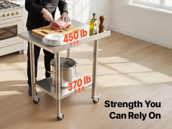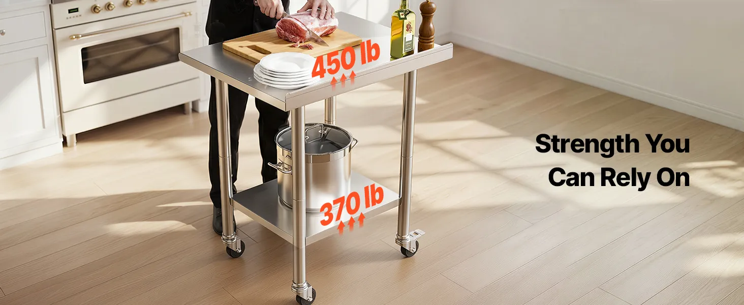 All-Stainless Steel Table: The food prep table is constructed from stainless steel (top, shelves, legs). Top shelf supports 450 lbs, lower shelf 370 lbs, providing sturdy, reliable support for heavy-duty equipment