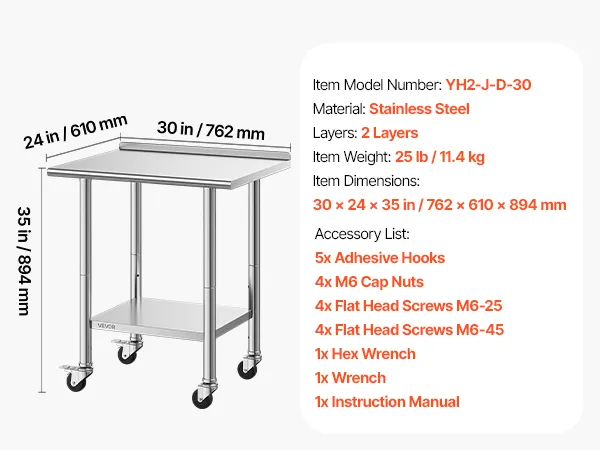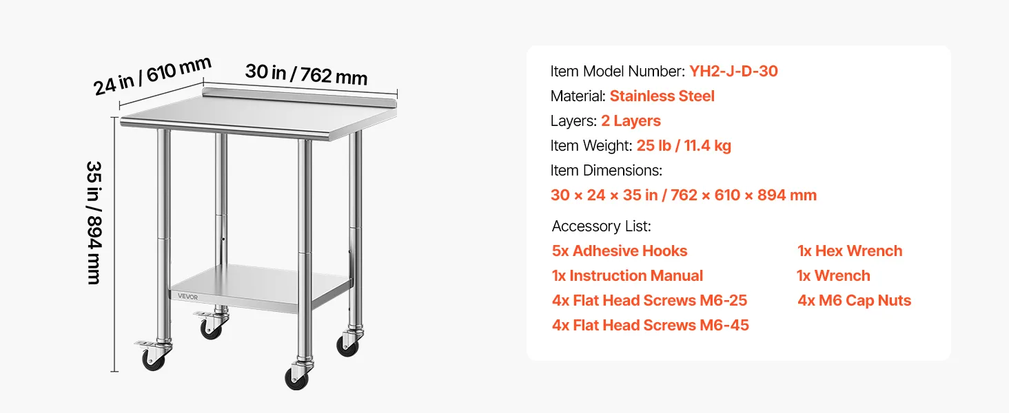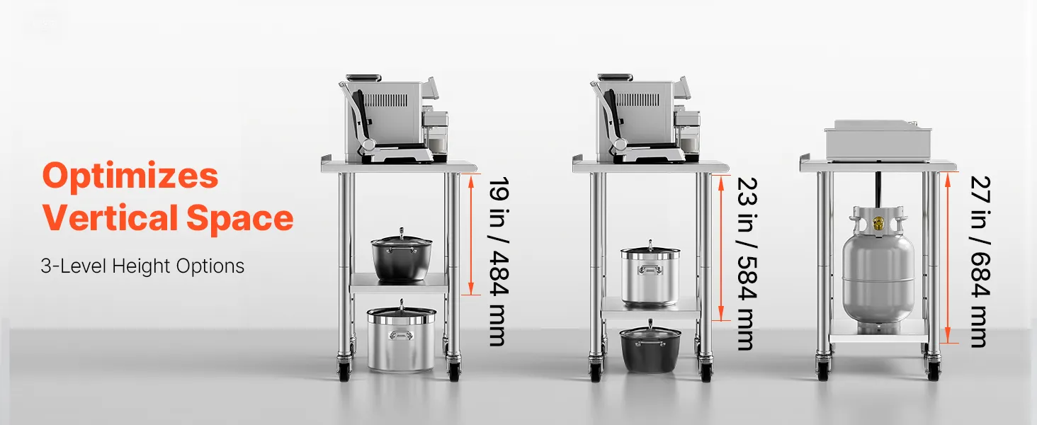 Mobility with Lockable Wheels: Equipped with 3-inch casters (2 lockable, 2 free), easily move the stainless steel table to desired location. Lockable wheels provide stability when needed