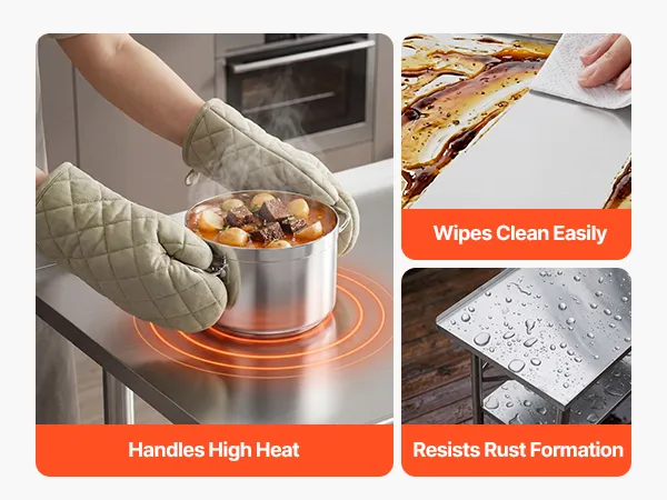 Rounded Edges & Back Splash: Curved edges reduce bumps and scratches. 30mm back splash blocks spills and food debris, keeping walls clean and operations secure and comfortable