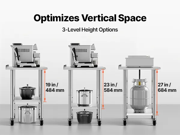 Adjustable Storage & Hooks: Lower shelf has 3 height options for flexible storage of pots, bins, or equipment. Our worktable & workstation includes 5 stainless steel hooks to hang tools or cloths, keeping the workspace organized and tidy