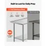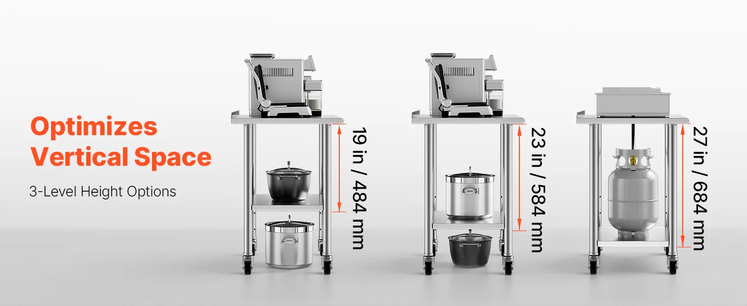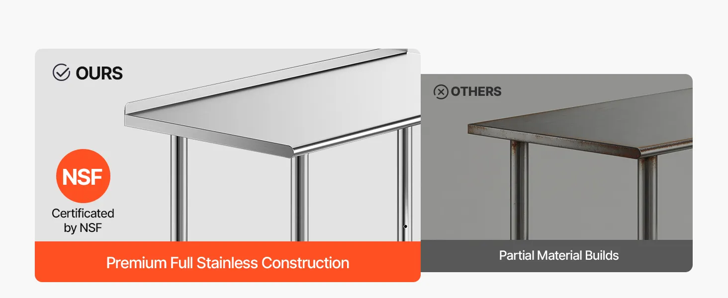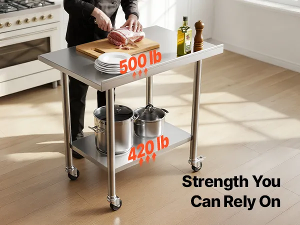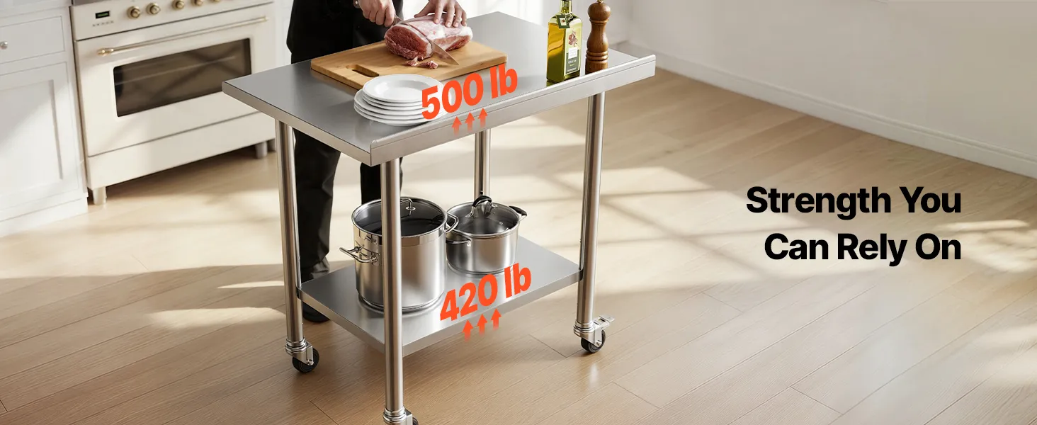 All-Stainless Steel Table: The food prep table is constructed from stainless steel (top, shelves, legs). Top shelf supports 500 lbs, lower shelf 420 lbs, providing sturdy, reliable support for heavy-duty equipment