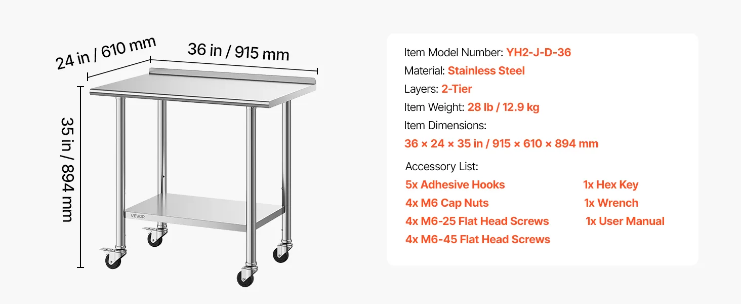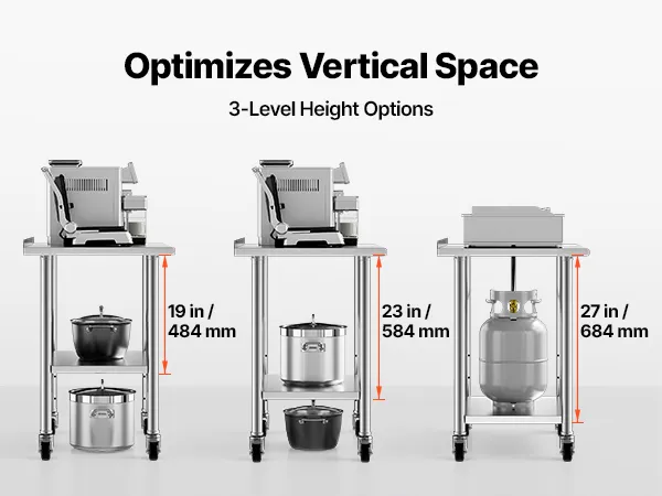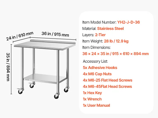 Mobility with Lockable Wheels: Equipped with 3-inch casters (2 lockable, 2 free), easily move the stainless steel table to desired location. Lockable wheels provide stability when needed