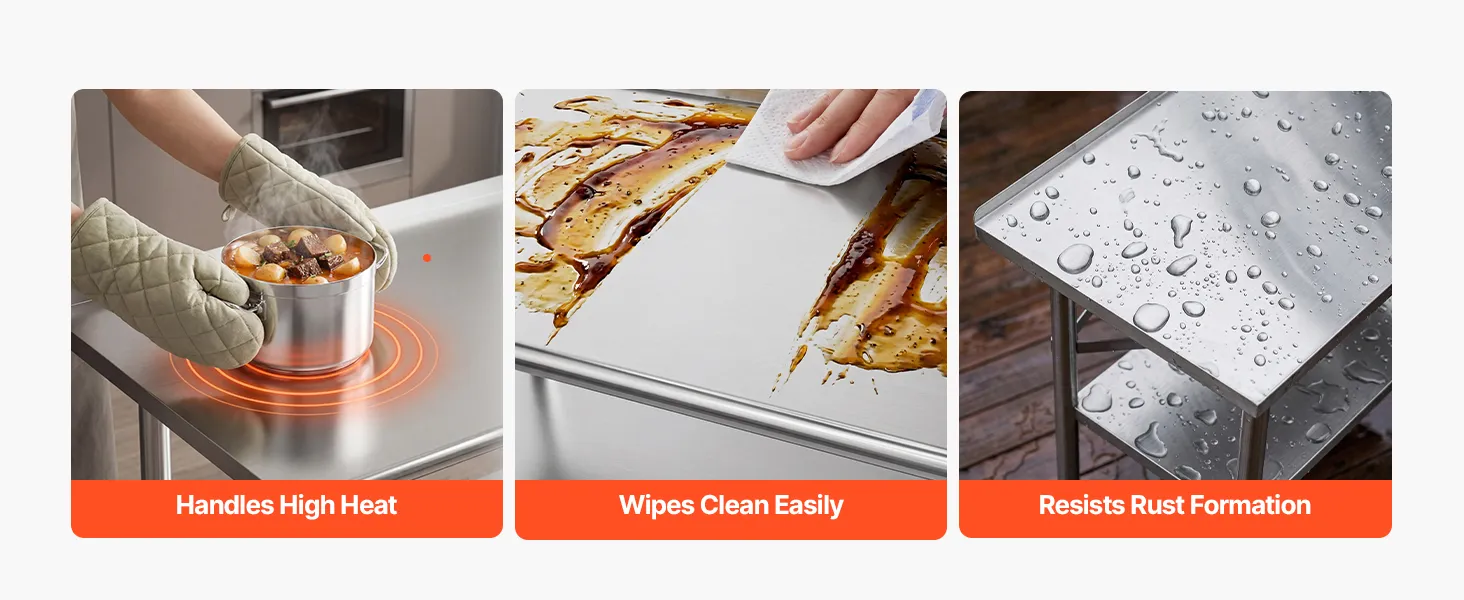 Rounded Edges & Back Splash: Curved edges reduce bumps and scratches. 30mm back splash blocks spills and food debris, keeping walls clean and operations secure and comfortable