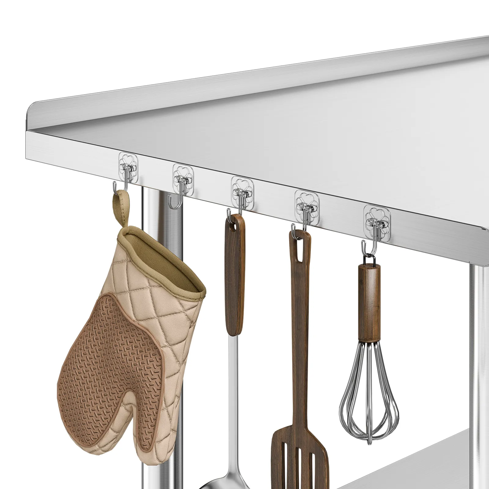 Adjustable Storage & Hooks: Lower shelf has 3 height options for flexible storage of pots, bins, or equipment. Our worktable & workstation includes 5 stainless steel hooks to hang tools or cloths, keeping the workspace organized and tidy