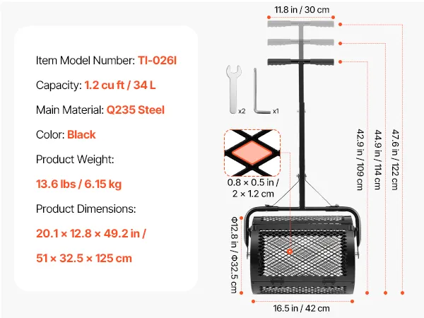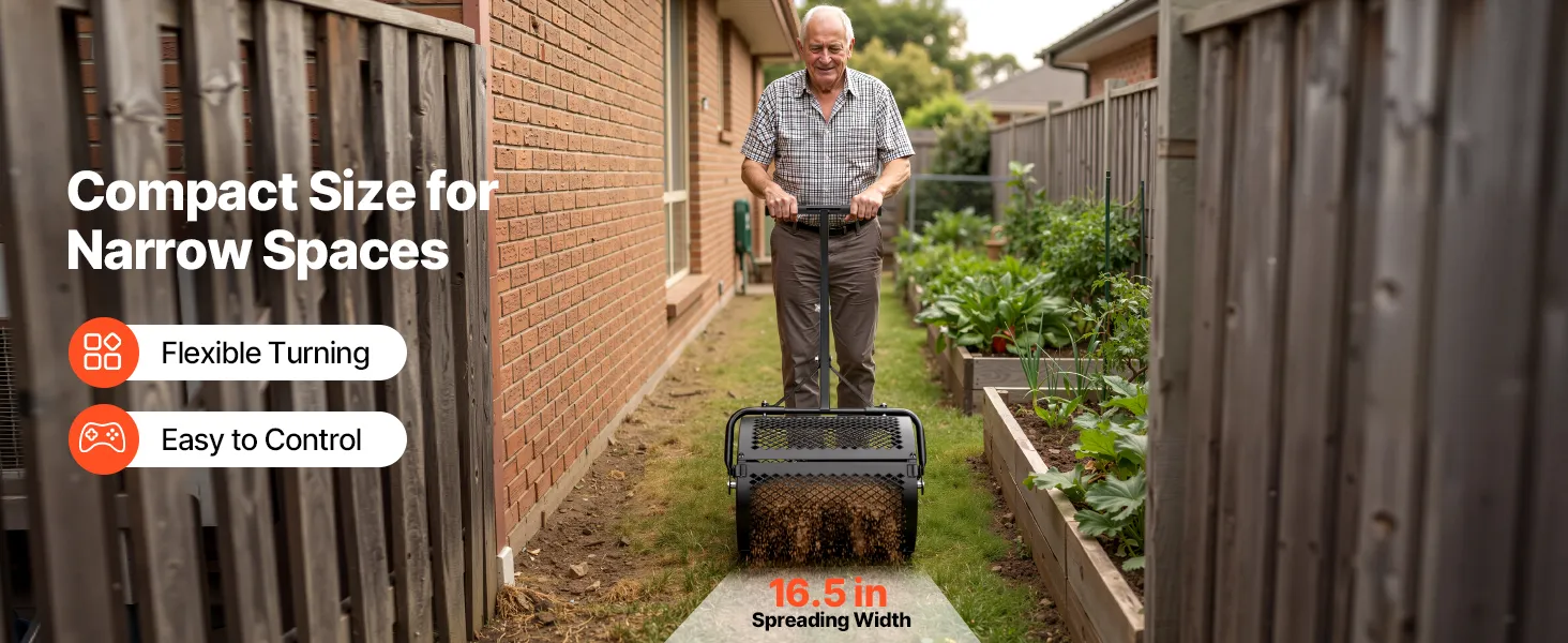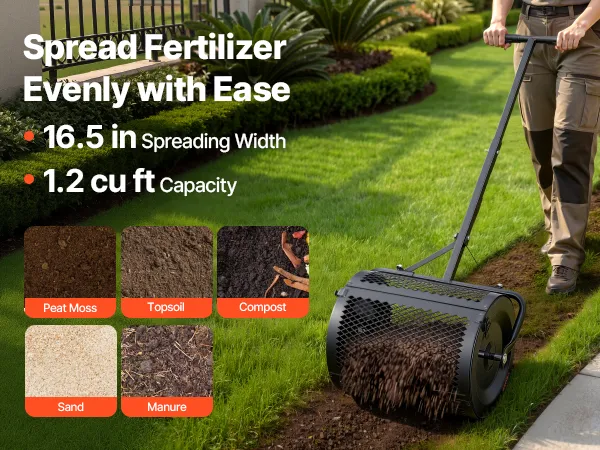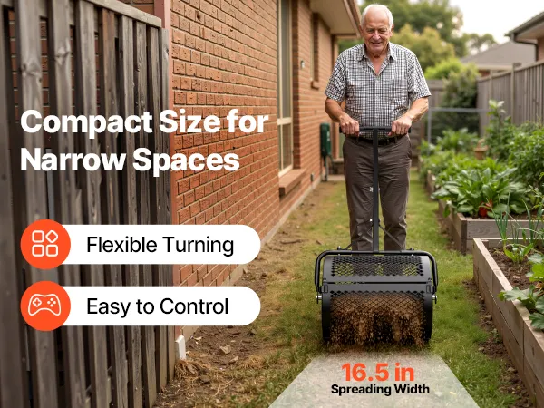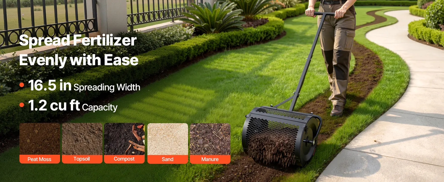 Flexible Spreading: Our compost spreader features a 16.5" x Ø12.8" (42 x Ø32.5 cm) drum with a 1.2 cu ft capacity. The 16.5" spreading width allows it to maneuver easily in tight spaces for lawn repair, weed control, or de-icing salt application