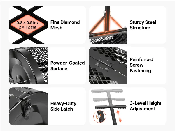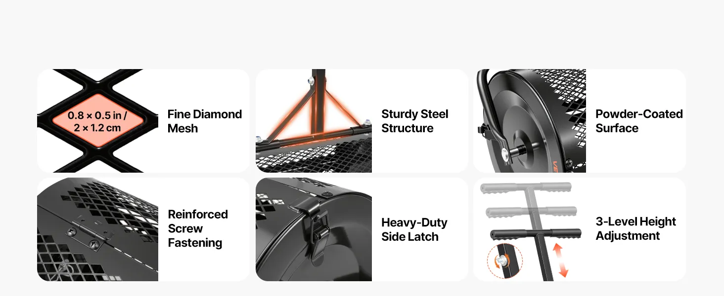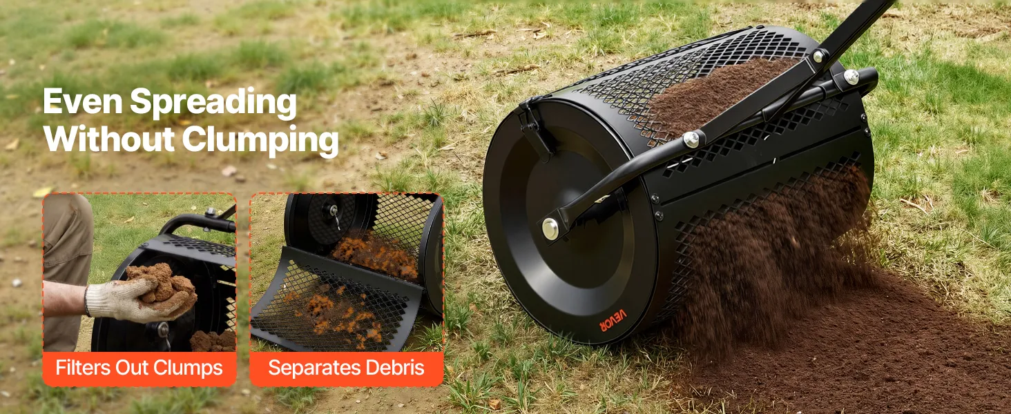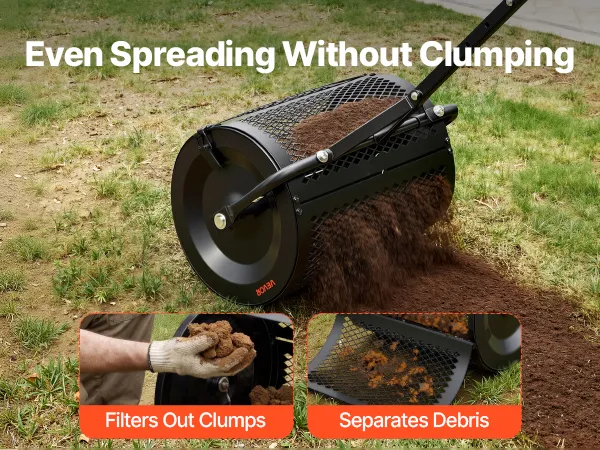 Even Spreading: This peat moss spreader uses dense diamond-shaped mesh (0.8" x 0.5" / 2 x 1.2 cm) to filter out debris and clumps for consistent distribution. It's suitable for peat moss, topsoil, compost, sand, and manure, promoting better lawn growth