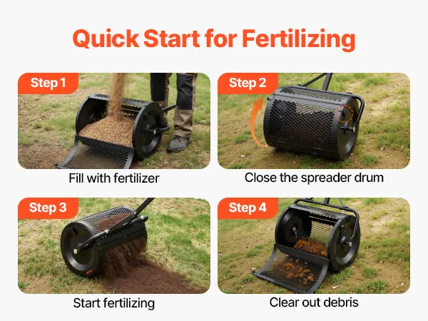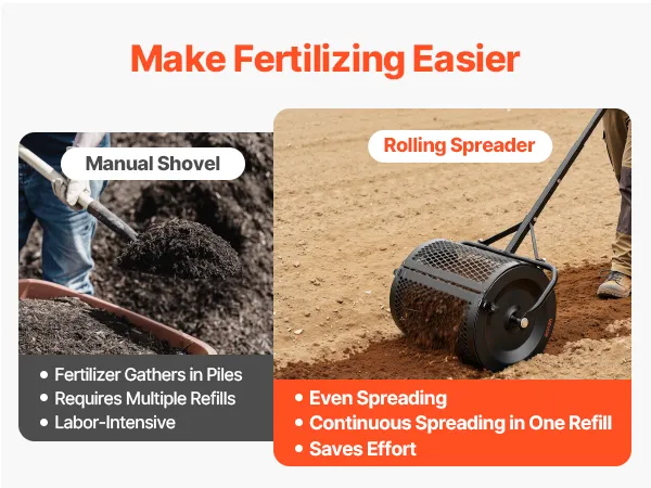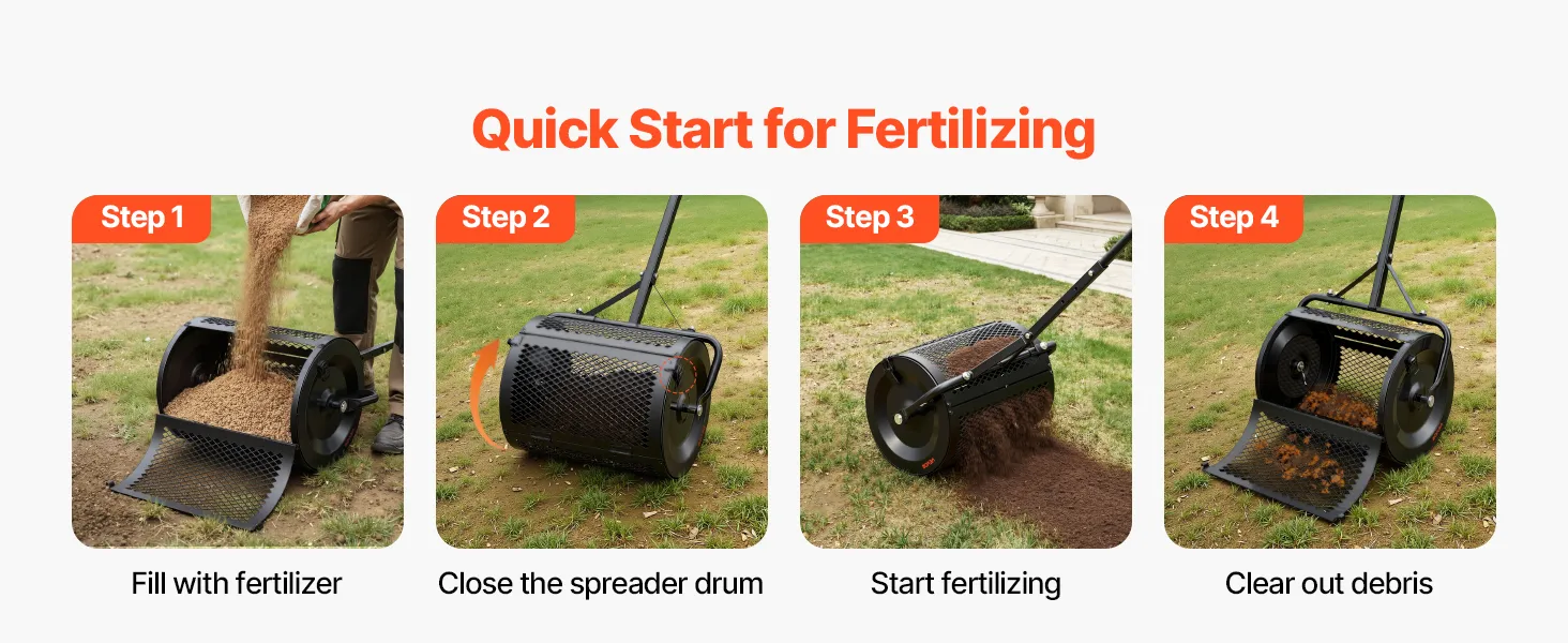 Easy to Use: The peat moss spreader for lawn has an 11.2" wide opening for easy filling from fertilizer bags or carts, reducing waste. Once loaded, simply secure the side latches and start spreading, and it includes clear instructions for quick setup