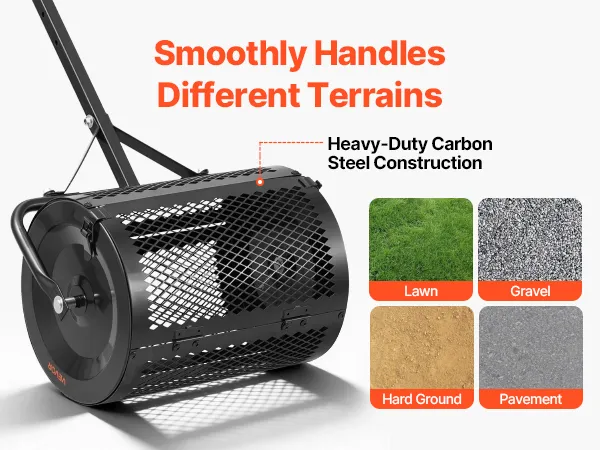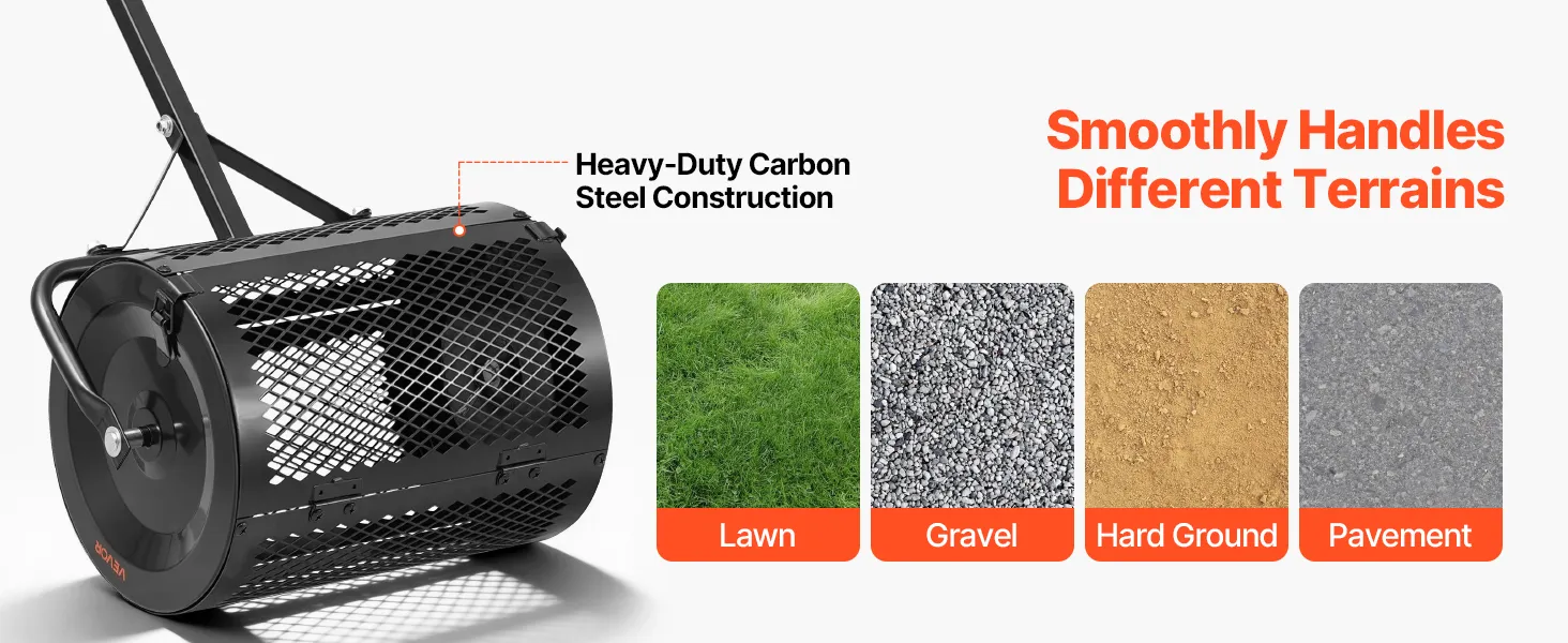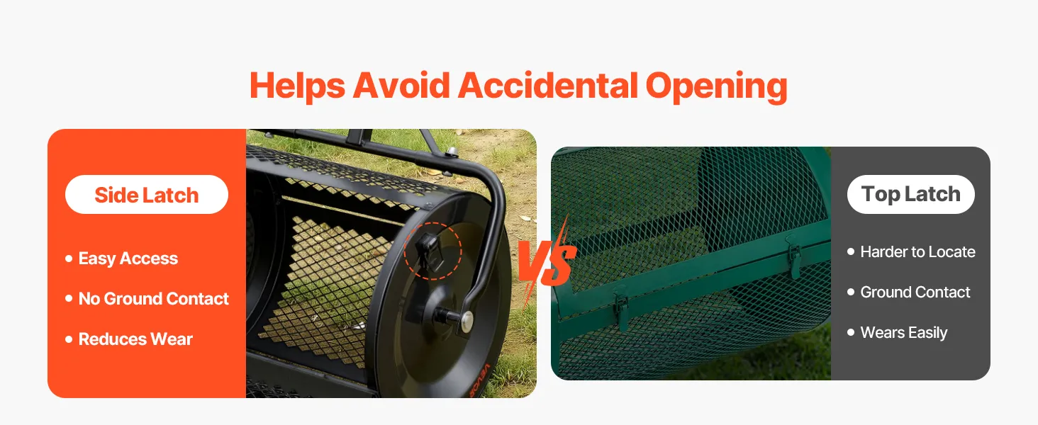 Built to Last: Made from carbon steel, the peat moss roller features a powder-coated surface for corrosion resistance. An upgraded triangular bracket keeps it stable on gravel, lawns, and hard ground, while metal side latches avoid accidental opening