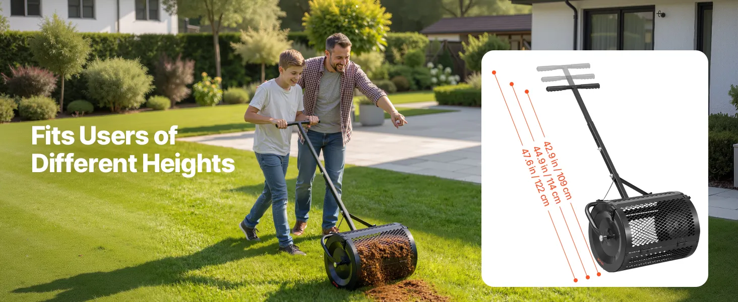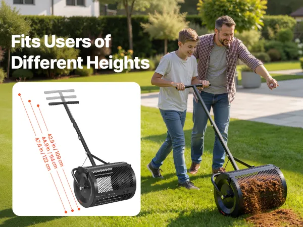 3-Level Adjustable Height: This topdressing spreader provides 3 height settings at 42.9" (109 cm), 44.9" (114 cm), and 47.6" (122 cm). By adjusting handle mounting holes, it fits users of different heights, while the ergonomic handle minimizes fatigue