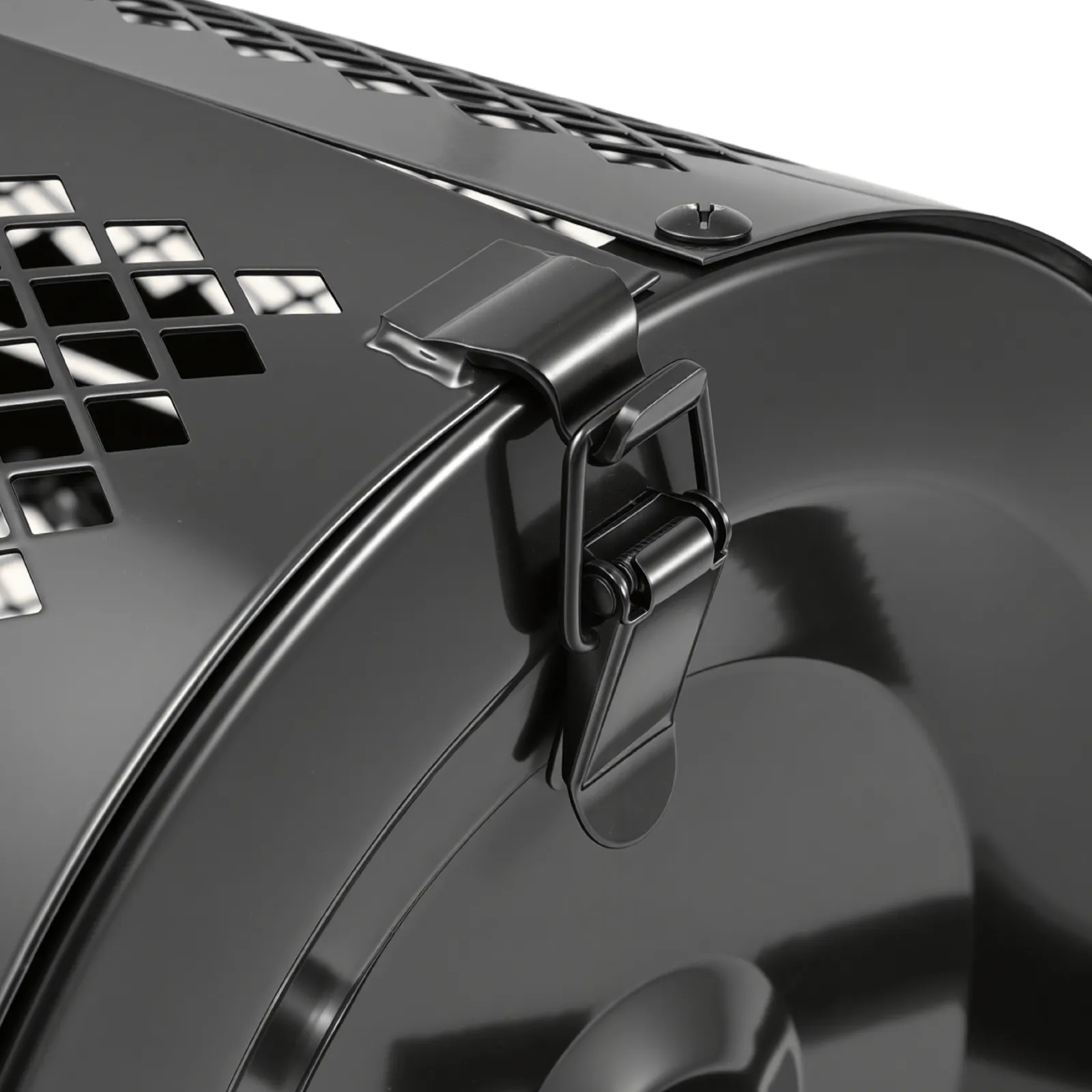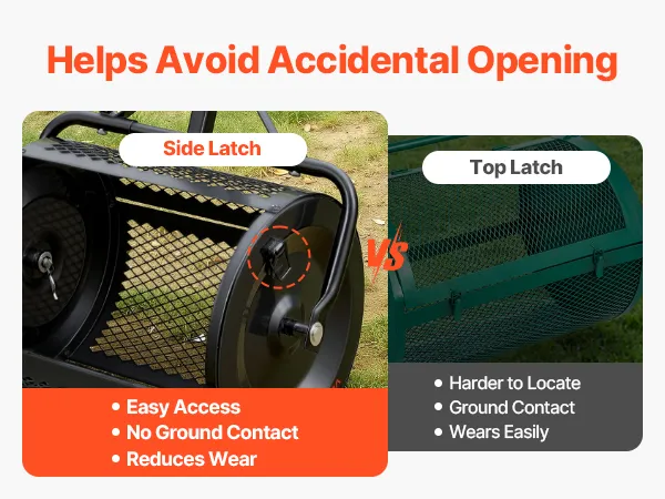 The peat moss spreader uses a side-mounted metal latch for quick opening and closing. Positioned away from ground contact, the latch reduces wear and extends service life.