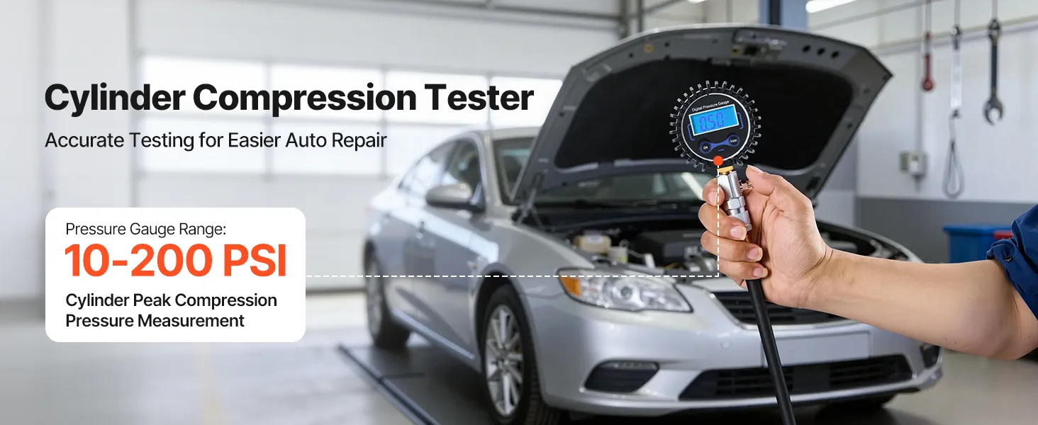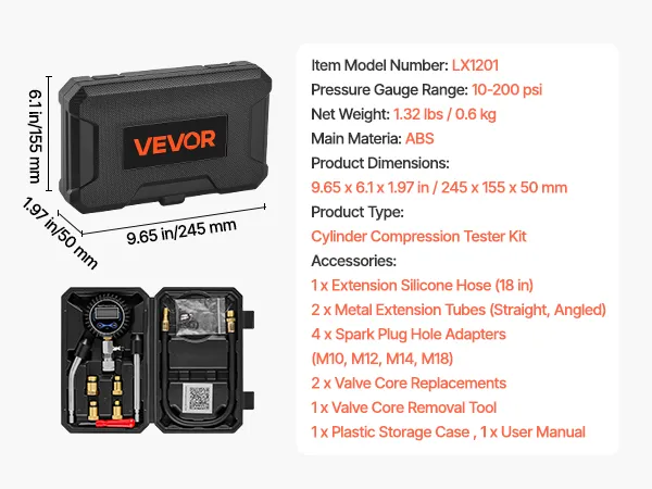 Fast Detection: Equipped with a 10-200 psi high-precision digital gauge and a built-in hold valve, this engine cylinder compression tester kit can capture and display peak compression pressure for quick sealing evaluation
