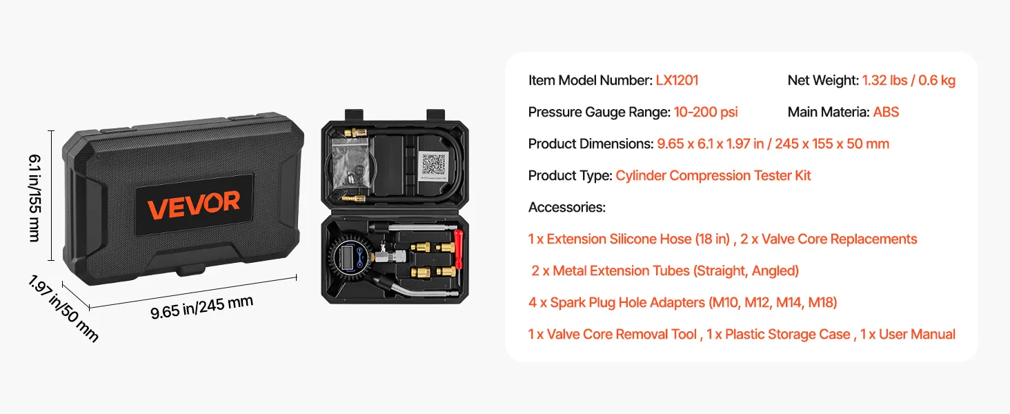 Compact & Portable: A custom case keeps all parts neatly secured. The sturdy, lightweight box is easy to carry and store, keeping the compression tester kit organized and ready to use