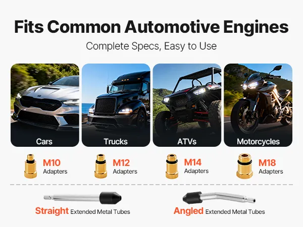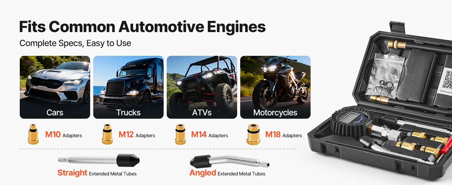 Wide Compatibility: The engine compression test kit includes four commonly used size adapters (M10, M12, M14, M18) and straight/angled extended metal tubes, fitting most gasoline and diesel spark plug ports