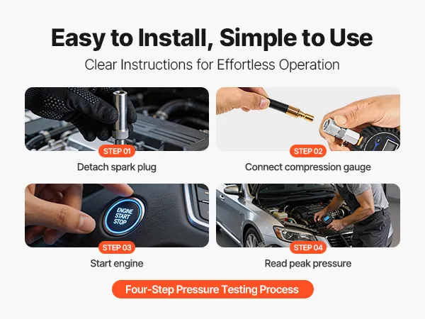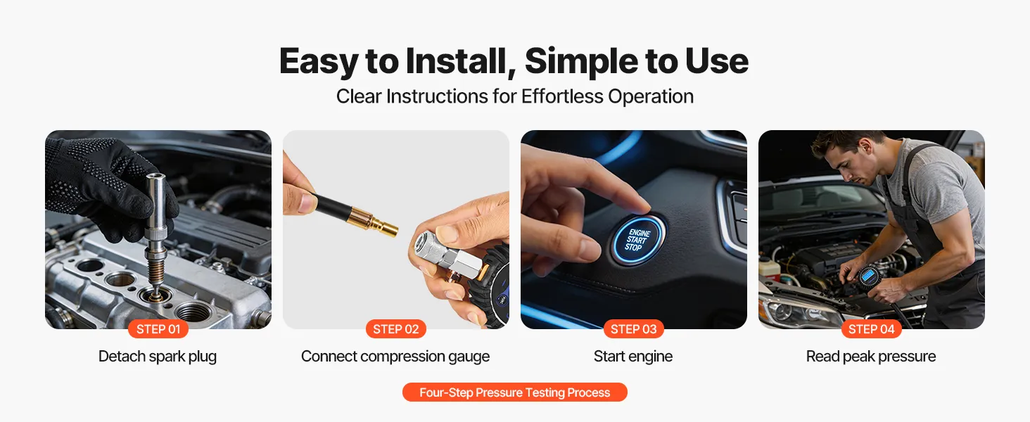 The compression test kit streamlines professional pressure testing into clear, guided steps. The clear step-by-step instruction manual enables users to easily perform standard tests and quickly obtain valid conclusions about the mechanical condition of the engine.