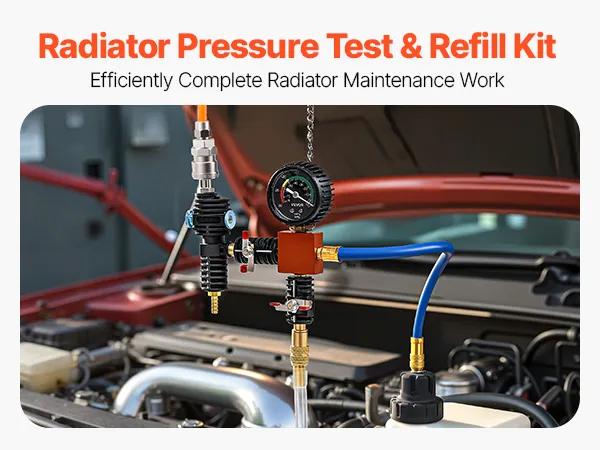 Radiator Pressure Tester Refill Kit: 47pcs radiator pressure tester kit includes a pressure pump, vacuum & coolant fill tool, metal adapters, color-coded test caps, and universal tapered adapter. A complete solution for leak detection, temperature checks, and fluid filling