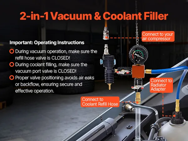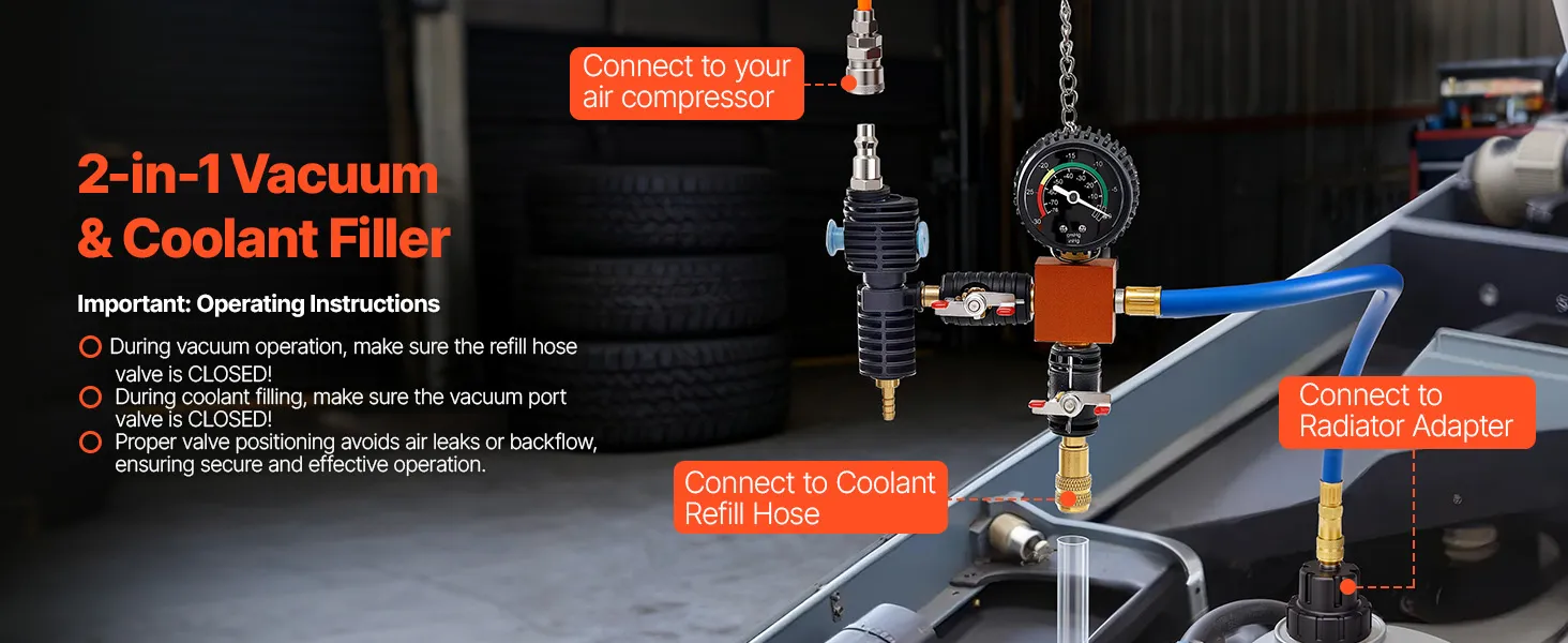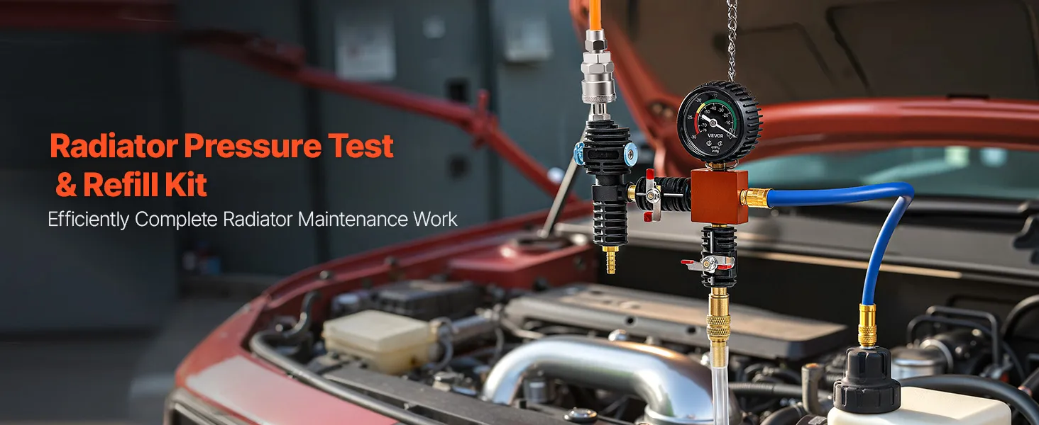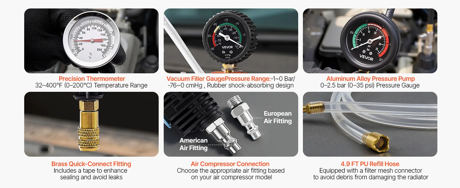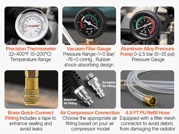 Efficient Vacuum & Coolant Filling: The radiator vacuum refill kit includes US-standard air nozzle plus an EU nozzle for flexible compressor connections. Extended transparent fill hose is durable and flexible, with a built-in filter to prevent debris from entering the radiator for safer, cleaner fluid filling