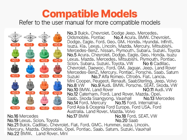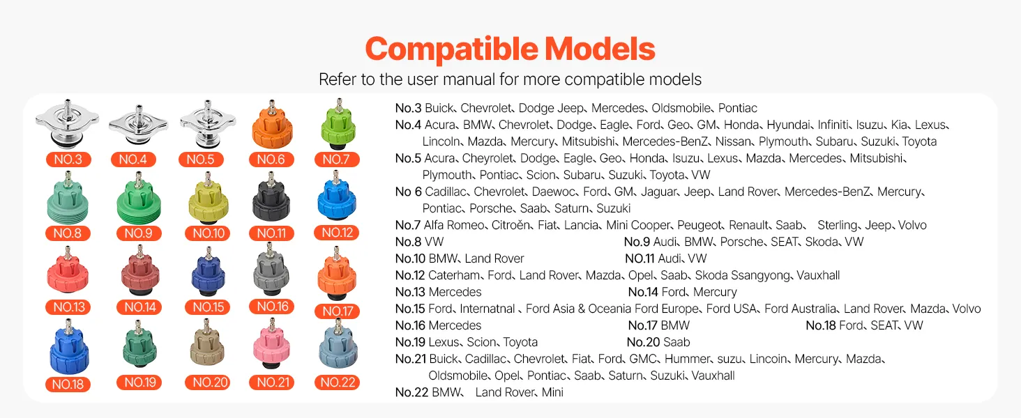 Universal Vehicle Compatibility: The coolant pressure tester kit comes with multiple adapter sizes and corresponding numbers on the packaging for easy identification. Compatible with most cars, SUVs, and light trucks, including BMW, Ford, Fiat, Volkswagen, Porsche, Mercedes-Benz, Nissan, and other mainstream brands