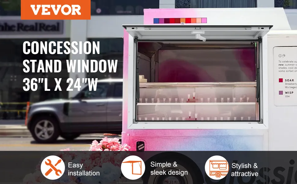 Precision Opening: The 36"L x 24"W multifunctional concession window is both attractive and practical, with precise dimensions for easy processing, installation, or dismantling. It's widely applicable in food trucks, concession stands, dining cars, BBQ trailers, mobile dining units, etc., and is perfect for participating in Food Festivals.