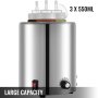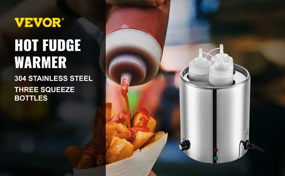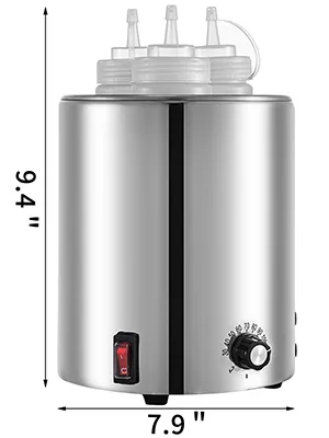 Premium hot fudge bottle warmer, made of 304 stainless steel material, Anti-rust, anti-corrosion, and easy cleaning. Temperature 30-110℃ (86-230℉) adjustable, easy to control, and operate. With three PE squeeze bottles, able to hold 1650 ml/1.45 qt sauce at a time. Perfect for melting nacho cheese, hot fudge, and other sauces.