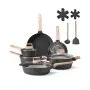 17-Piece Cookware Set: A versatile pots and pans set that includes: 6in sauce pan with lid, 7in sauce pan with lid, 8in frying pan, 11in frying pan, 11in saute pan with lid, 9in stockpot with lid, 2 10x10in pan protectors, 3 14x14in pan protectors, silicone spoon, silicone shovel