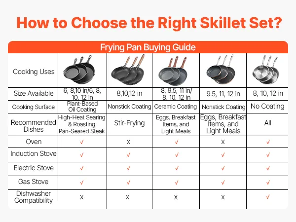 Works with All Cooktops: Suitable for frying, searing, steaming, simmering, baking, and stir-frying. This skillet set is compatible with gas, electric, and induction stoves for added cooking flexibility