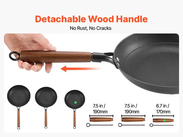 Wood Handle, Quick to Detach: The ergonomic handle provides a secure grip and stays cool while cooking. Easily detachable, it lets you transfer the pan to the table for serving. Made from quality material that resists cracking and wear over time
