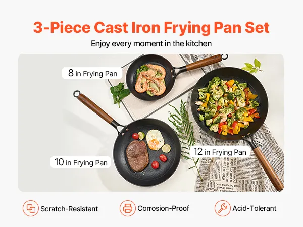 Our cast iron skillet set includes 8, 10 and 12-inch frying pans. Engineered for fast, even cooking, these pans help preserve the natural nutrients of your ingredients while meeting a wide range of everyday cooking needs.