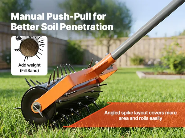 Durable Steel Build & Fillable Drum: Made from high-quality steel, this rolling lawn aerator is built for long-term use. The drum can be filled with sand or stones to add weight, using gravity to drive the spikes deeper into the soil for noticeably improved aeration