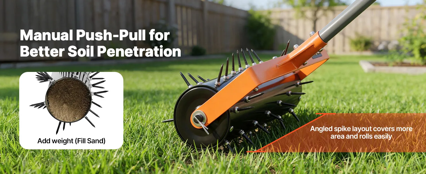 The aerator tool for lawn features rolling design that loosens soil as you push and pull, allowing continuous aeration in both directions. This motion creates more holes in less time, while the angled spike layout expands coverage with every pass.