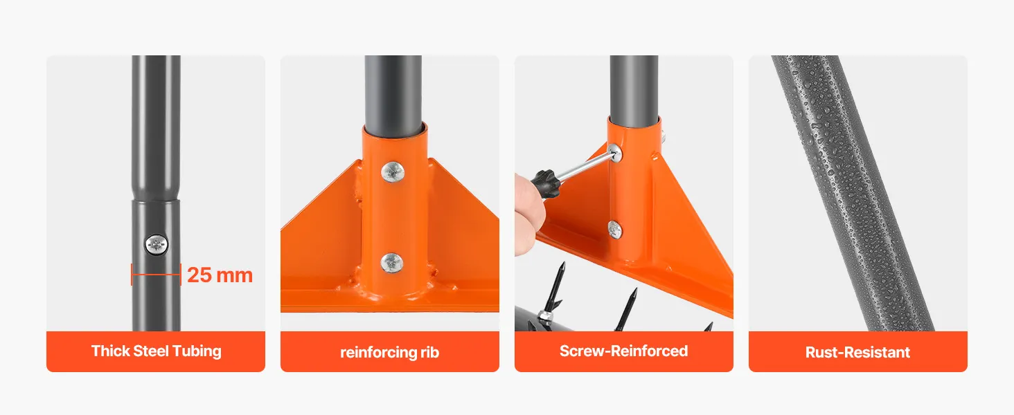 Designed for outdoor use, this aerator roller uses thickened 25 mm steel tubing, a fully welded one-piece frame, and reinforced bolts to avoid bending under pressure. A rust-resistant coating protects against rain, moisture, and soil corrosion.