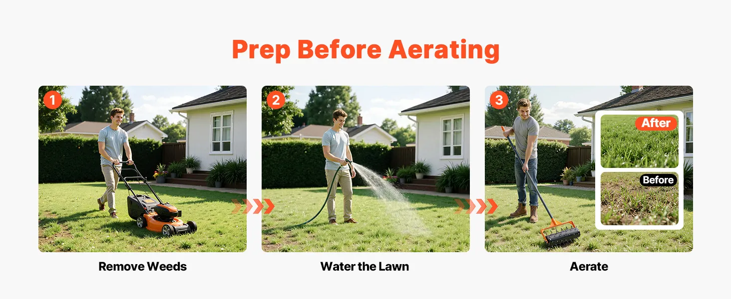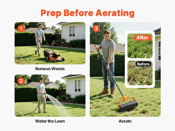For improved performance, clear weeds and lightly water the lawn beforehand to keep the soil slightly moist. This helps the heavy duty aeration tool penetrate more easily and deliver deeper airflow and nutrients to the roots.