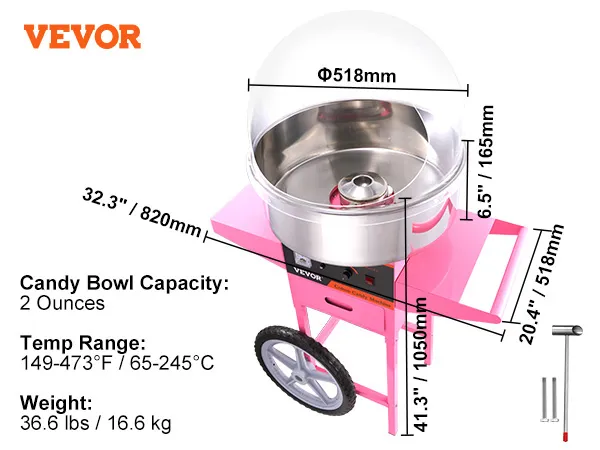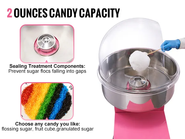 Work with Any Candy You Like: This cotton machine allows you to use the traditional flossing sugars, milk sugars, fruit cubes, or any of your favorite hard candies to make delicious cotton candies. Large wheels and sturdy handle facilitate movement, and it is perfect for carnivals, festivals, birthday parties, and sports events.