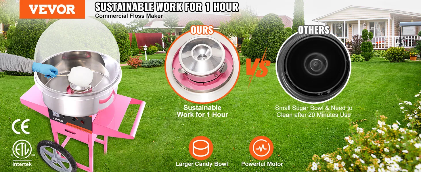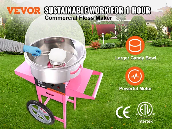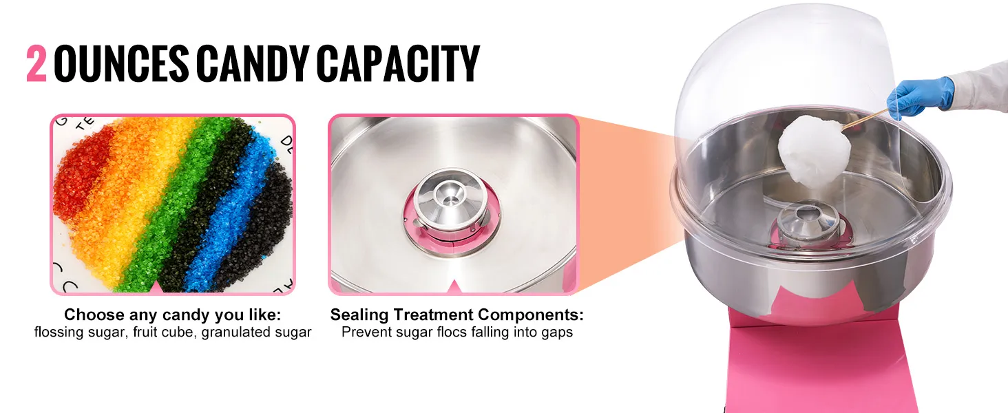 This cotton candy maker has a powerful motor and larger candy bowl providing about 6 cotton candies per minute. This candy floss maker can work continuously for one hour. It is perfect for various parties and is suitable for most kinds of sugar.