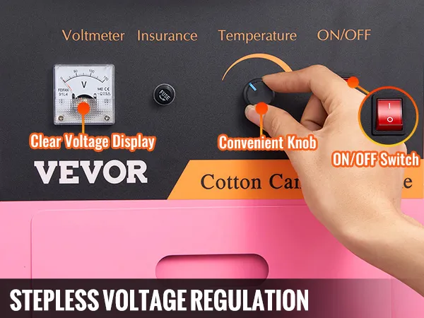 Temp Control: Unlike the common ones, our electric candy floss maker features a voltage meter and a temp control knob. By changing voltage, you can simply adjust the temperature from 149℉ to 473℉. If you want to try different flavored sugars, you will absolutely need this.