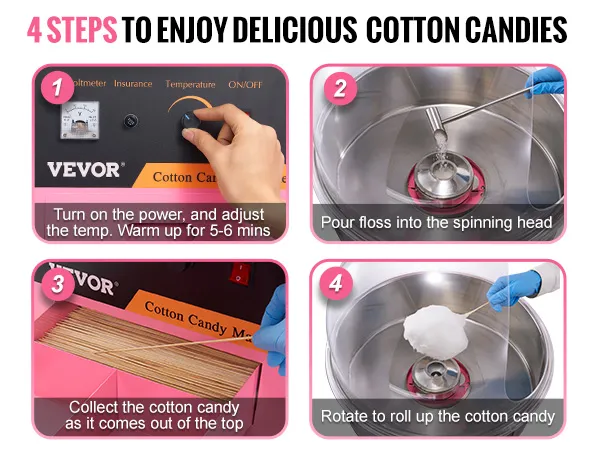 Easy-Operating Process: Using this machine couldn't be easier. Turn on the power, adjust the temperature, warm up for 5-6 minutes, and pour sugar into the spinning head, and then you just need to use the sticks to collect the cotton candies from the head.