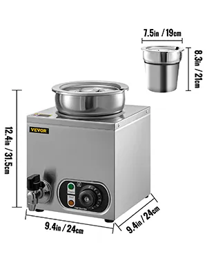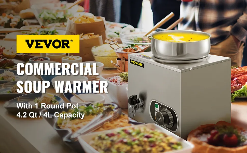 Food-Grade Stainless Steel: The food-grade 304 stainless steel structure brings this commercial soup warmer with rust and corrosion resistance. The thickened wall ensures sturdiness and durability, precluding worry about deformation or scratch. In addition, the detachable pot makes cleaning and maintenance a breeze.