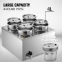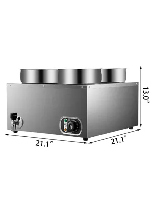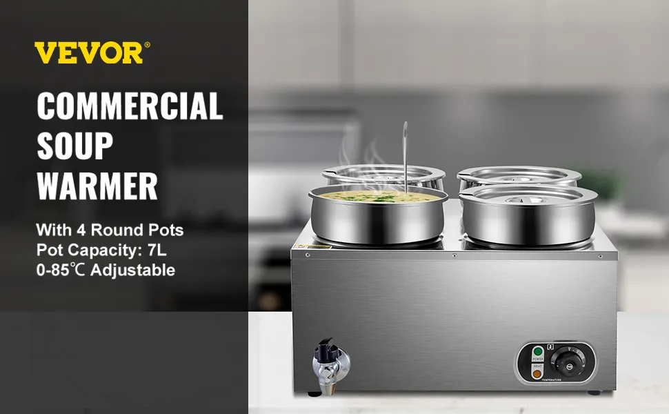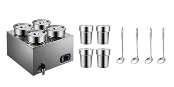 Our commercial soup pot with four 7.4-quart (7L) inserts will keep toppings, soups, and cheese at precise temperatures. The heavy-duty stainless steel construction contributes to its easy cleaning and effortless maintenance. Also, it features stainless steel heating elements, temperature control, and drainage faucet, perfectly designed for commercial uses, such as restaurants, supermarkets, snack bars, etc.