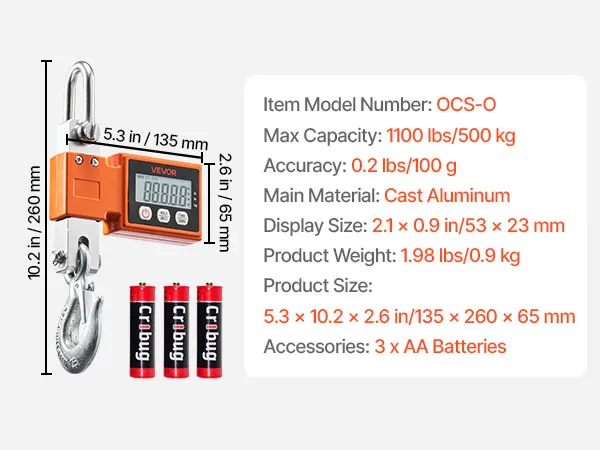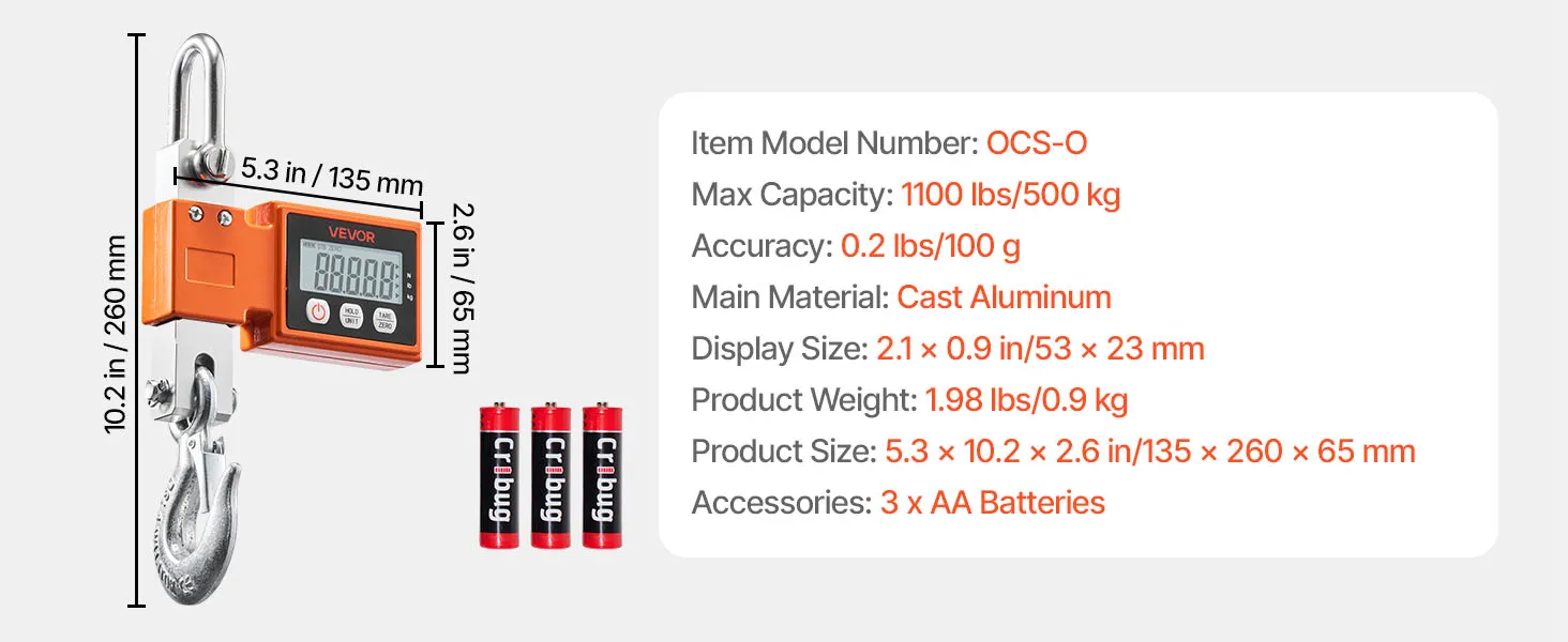 VEVOR Digital Crane Scale, 1100 lbs/500 kg Max Capacity, Heavy Duty Industrial Hanging Scale with Cast Aluminum Case & LCD Display, 100 g Division & 3 Unit Switch, Auto-Off Setting for Garage