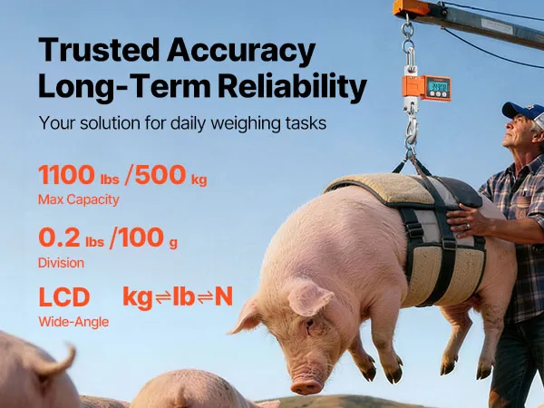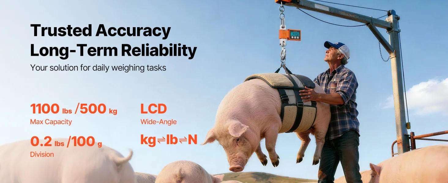 High Precision & Capacity: This crane scale measures up to 1100 lbs/500 kg with 0.2 lb/100 g resolution. You switch units among kg/lb/N in seconds. From eggs to full-grown boar, readings stay steady and reliable