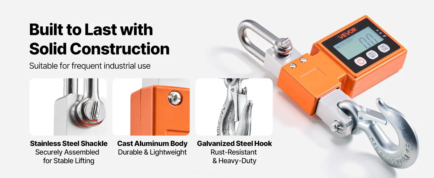 Rugged & Anti-Release: This industrial hanging scale features a full cast-aluminum body for corrosion resistance in damp, dusty sites. A stainless shackle and anti-release steel hook help resist loosening or bending to keep loads secure