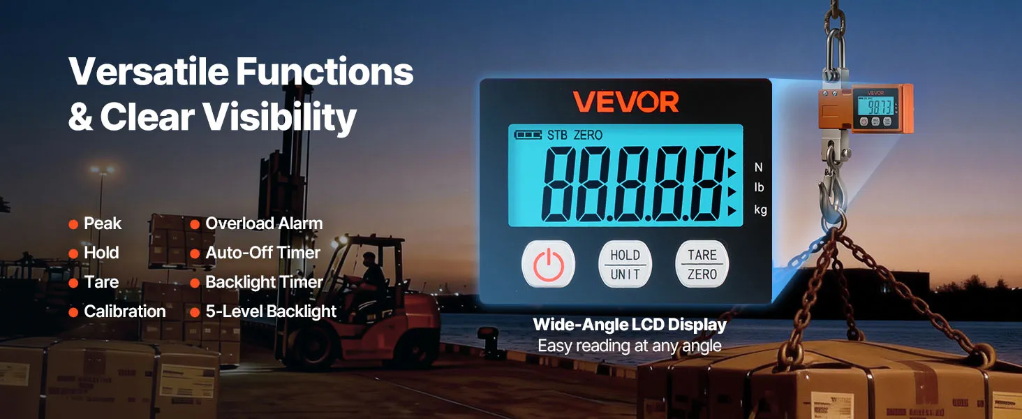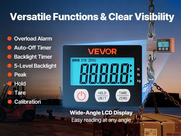 User-Friendly Features: This digital crane scale adds Peak Hold, Data Hold, Tare, Calibration, Overload Alert, and Auto-Off. The clear layout keeps setup quick and everyday operation easy