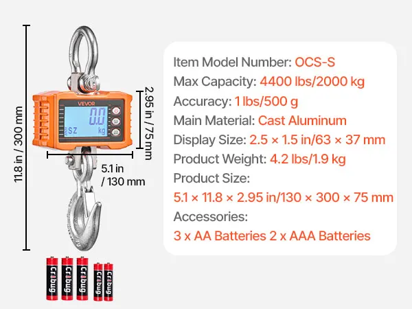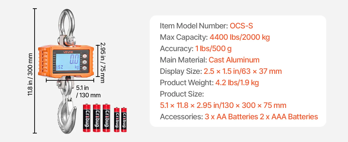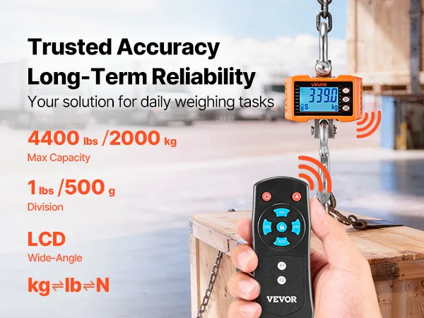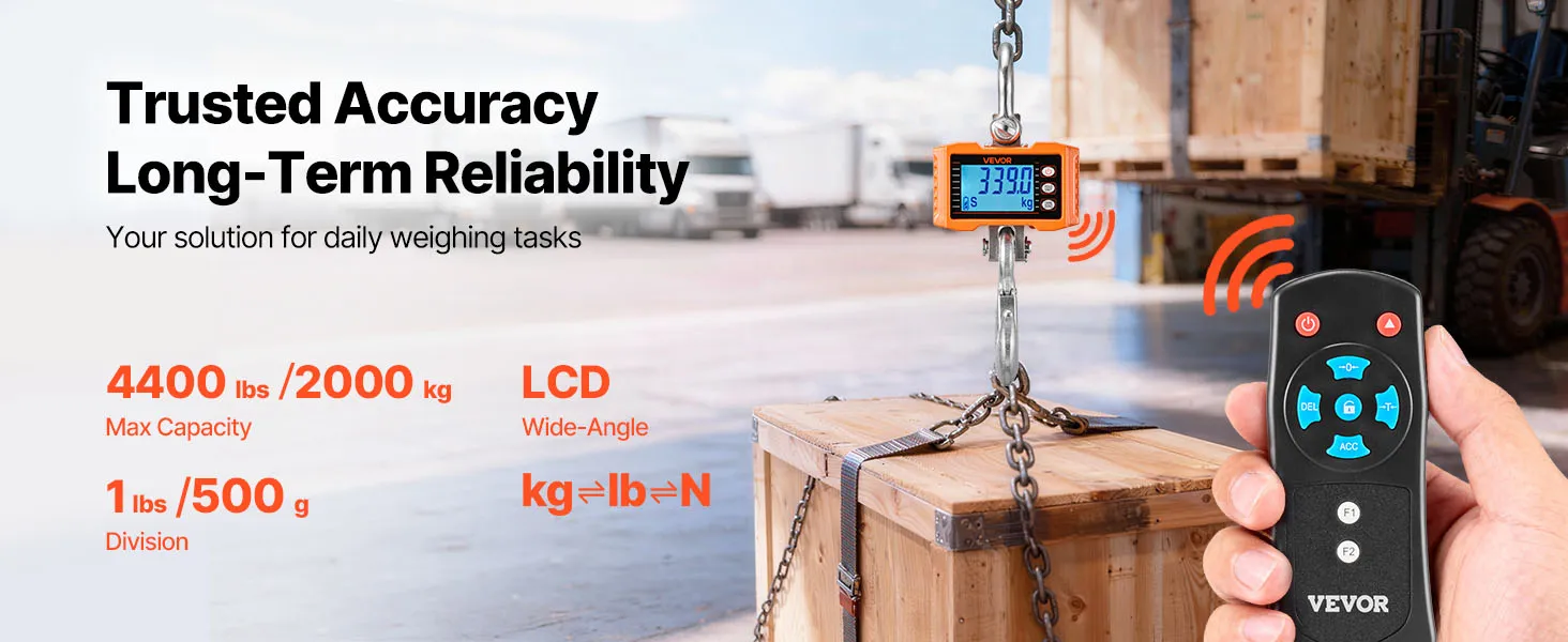 High Precision & Capacity: This crane scale measures up to 4400 lbs/2000 kg with 1 lb/500 g resolution. You switch units among kg/lb/N in seconds. From lambs to medium-sized industrial motors, readings stay steady and reliable