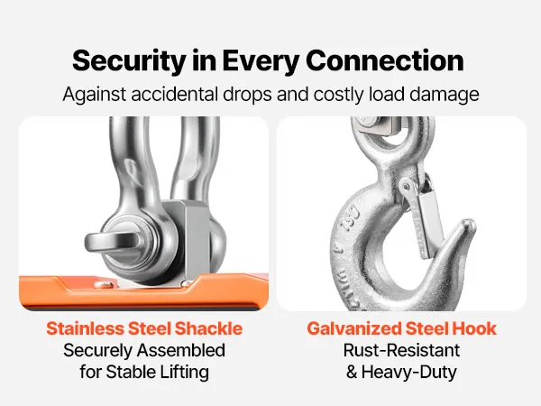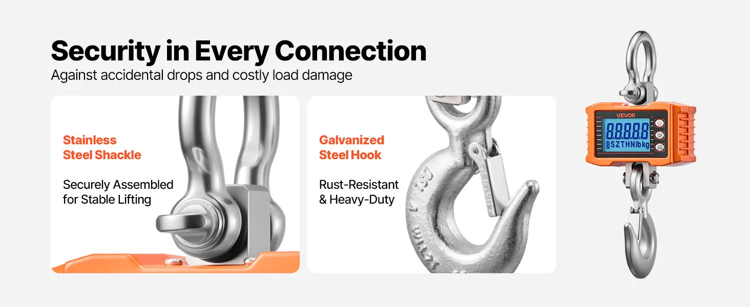 This industrial hanging scale uses a stainless-steel shackle and zinc-plated steel hook that resist deformation and corrosion. The sturdy setup helps avoid accidental unhooking and keeps suspended loads secure—job after job!