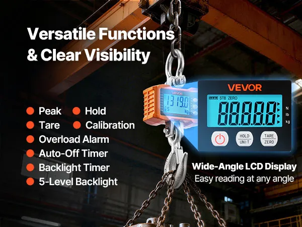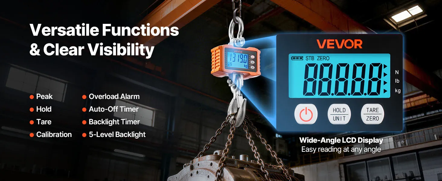 User-Friendly Features: This digital crane scale adds Peak Hold, Data Hold, Tare, Calibration, Overload Alert, and Auto-Off. The clear layout keeps setup quick and everyday operation easy